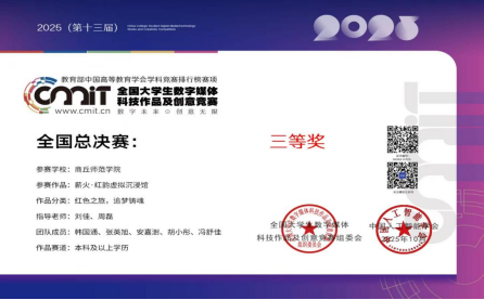 近日,2025年(第十三届)全国大学生数字媒体科技作品及创意竞赛全国总决赛结果揭晓,beat365官网翎创游戏研发社团学生团队凭借作品《薪火·红韵虚拟沉浸馆》,从众多参赛作品中脱颖而出,荣获全国总决赛三等奖。