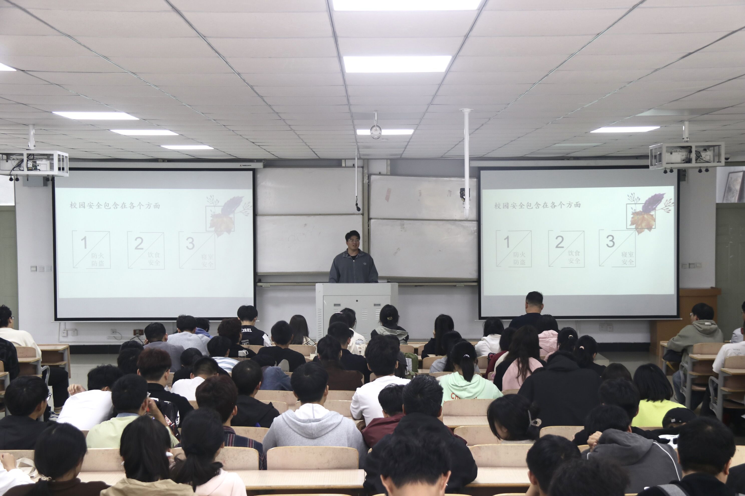 彭老师分别从宿舍安全、宿舍长的职责、突发事件处理以及宿舍文化养成等方面与同学们进行讲解,并根据各高校案例让同学们认识到了寝室安全、文明、卫生、和谐的重要性。团委学生会公寓部部长马梓淳从如何提升校园安全意识、寝室安全和网络安全以及如何构建良好宿舍氛围等方面进行讲解。