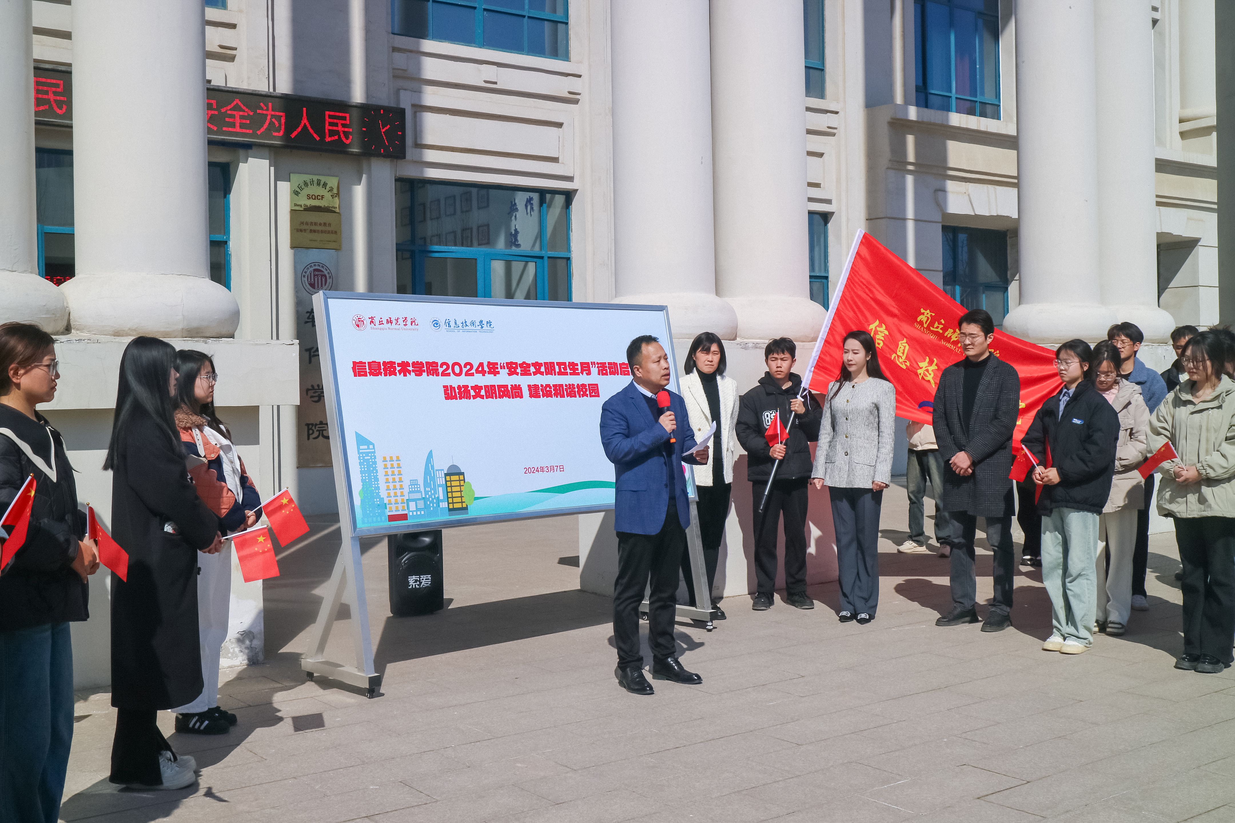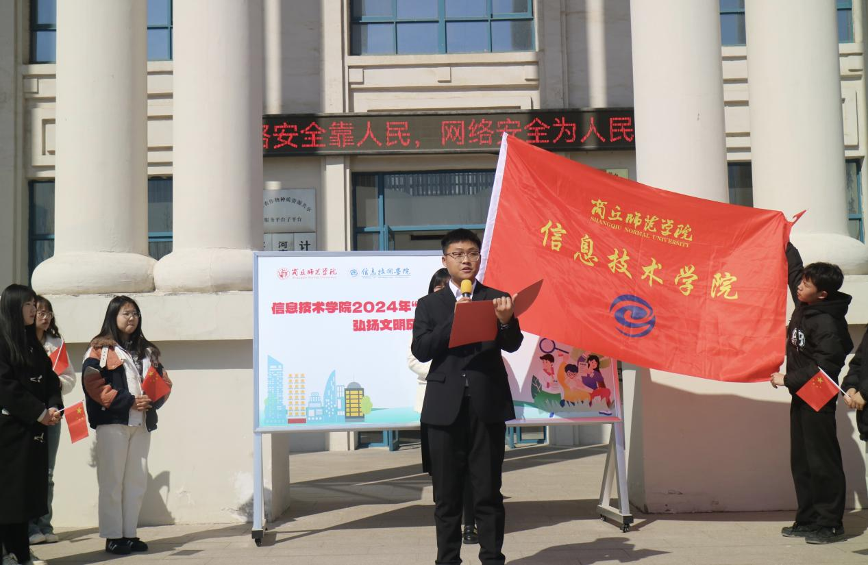 学生代表李晨光做了表态发言,积极参与学院组织的各项活动,从自身做起、从点滴做起,为创建一个安全、文明、和谐的校园环境贡献自己的力量。