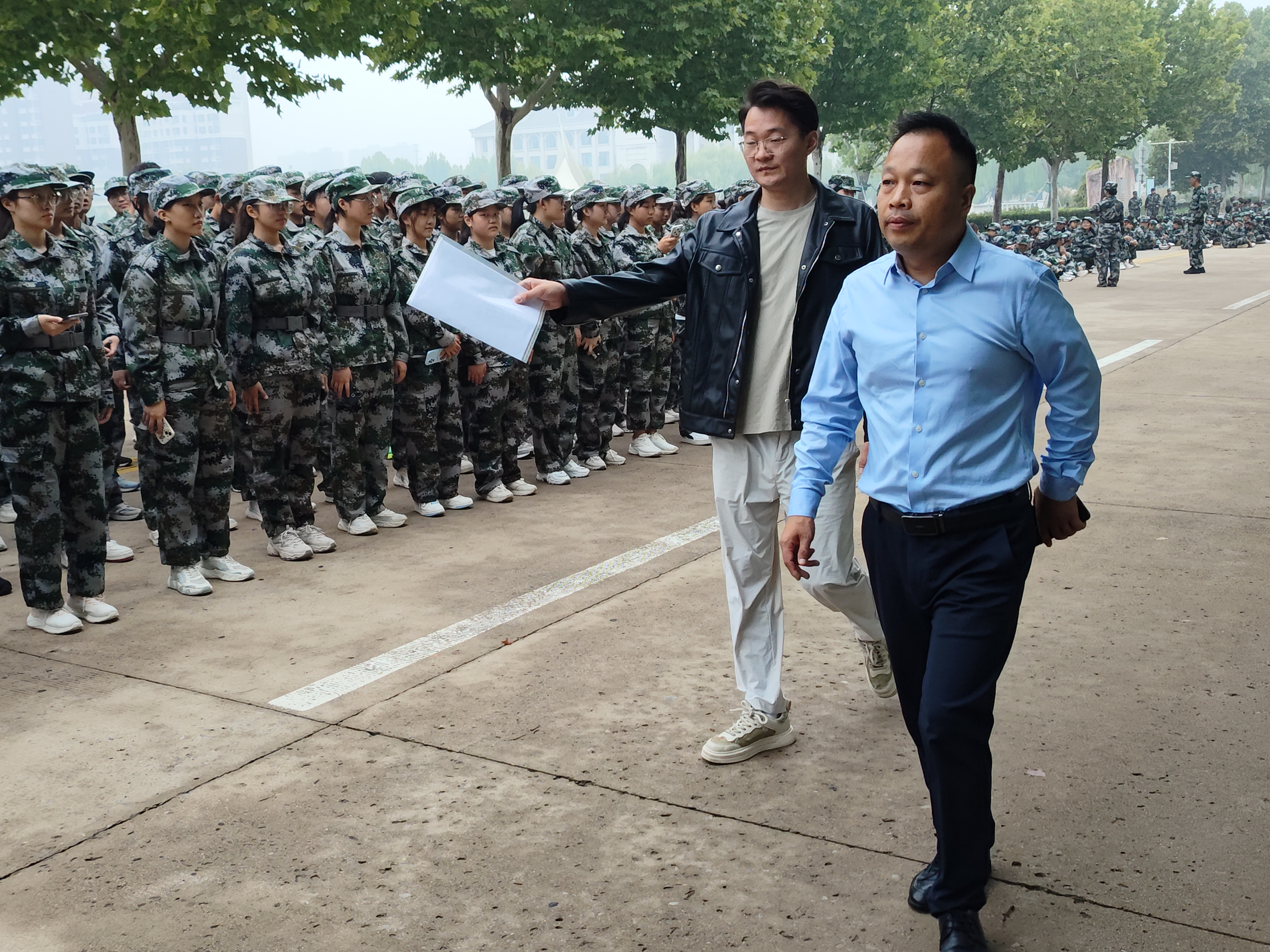 领导们深入了解训练情况,并强调军训意义:提升国防意识,树立国家安全观;增强纪律性,磨炼意志;培养良好习惯,健康是基石。希望同学们珍惜军训时光,增强体魄。
