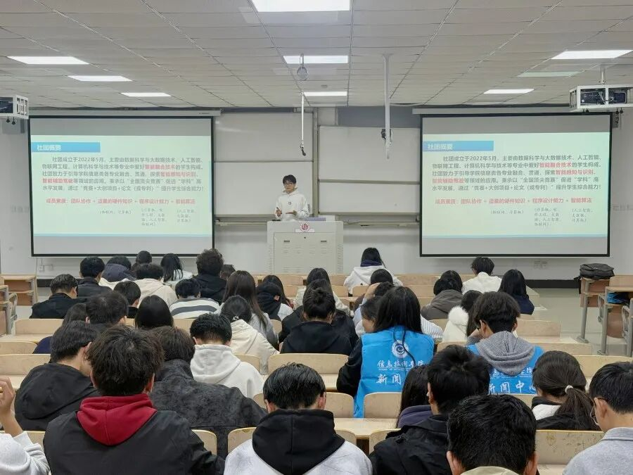 活动伊始,特邀专家围绕信息技术专业领域前沿动态展开分享,结合具体实例分析行业发展趋势,为同学们提供专业学习指导与建议。随后的汇报展演环节,社团成员紧扣专业特色,充分展示自身优势,通过精心准备与演示,全面呈现了各社团的独特魅力与蓬勃朝气。汇报过程中,各社团负责人不仅介绍了社团发展情况与特色活动,鼓励新生积极探索、找到兴趣方向;还详细分享了社团组织参与的各类竞赛及取得的优异成绩,充分展现了社团取得的成绩与综合实力。