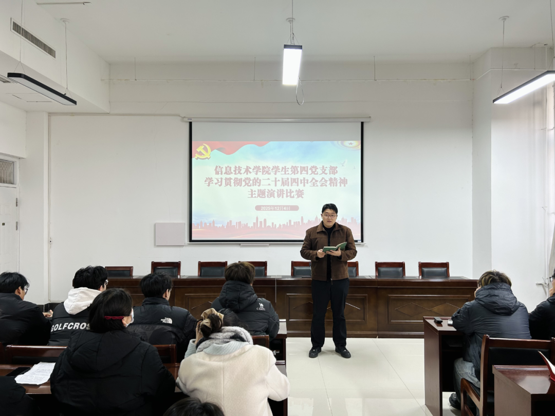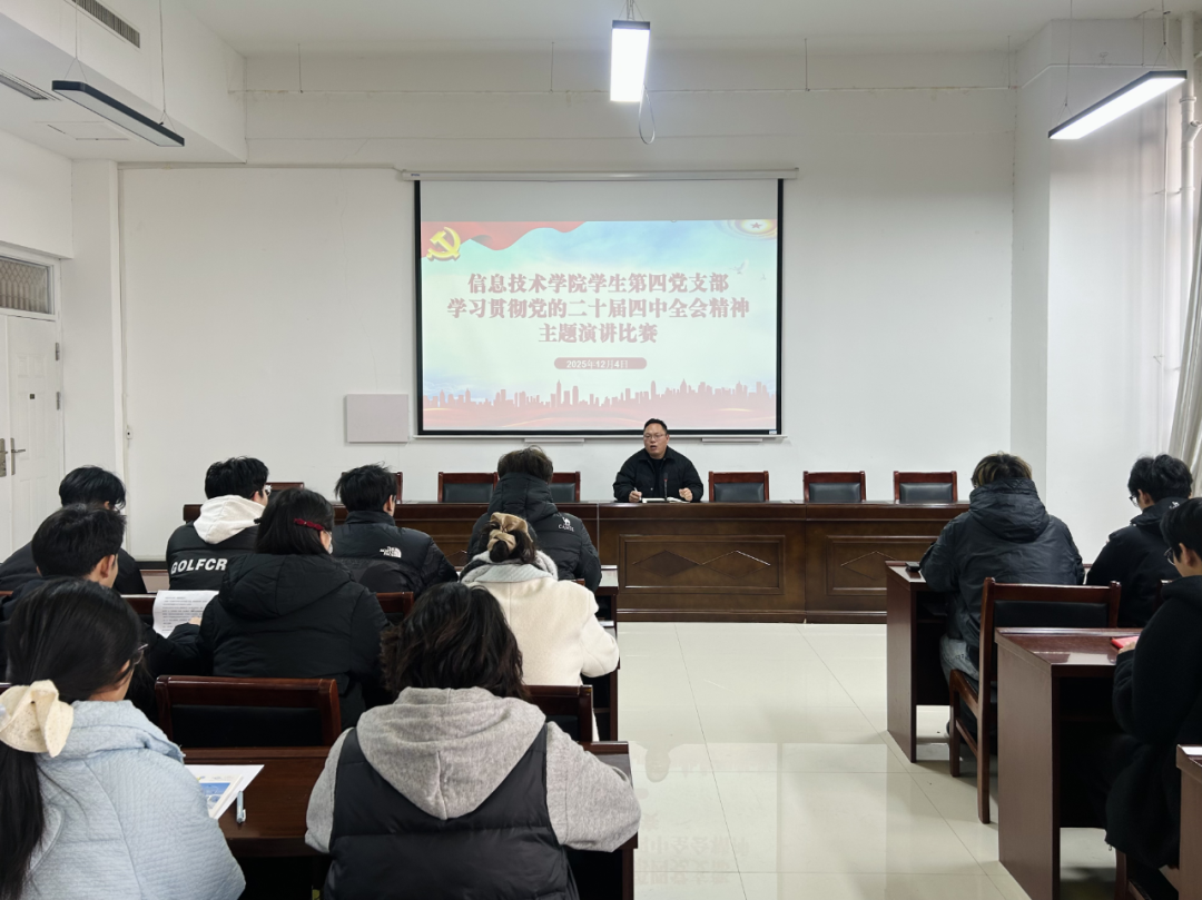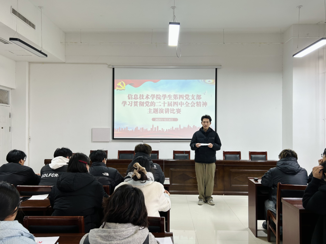 为深入学习贯彻党的二十届四中全会精神,引导支部党员牢记和践行初心使命,12月4日,beat365在线唯一官网学生第四党支部在梁园校区三商楼112会议室顺利举办了“学习贯彻党的二十届四中全会精神”主题演讲比赛。本次比赛由学生第四党支部书记彭会锋同志主持,支部全体党员同志积极参与。