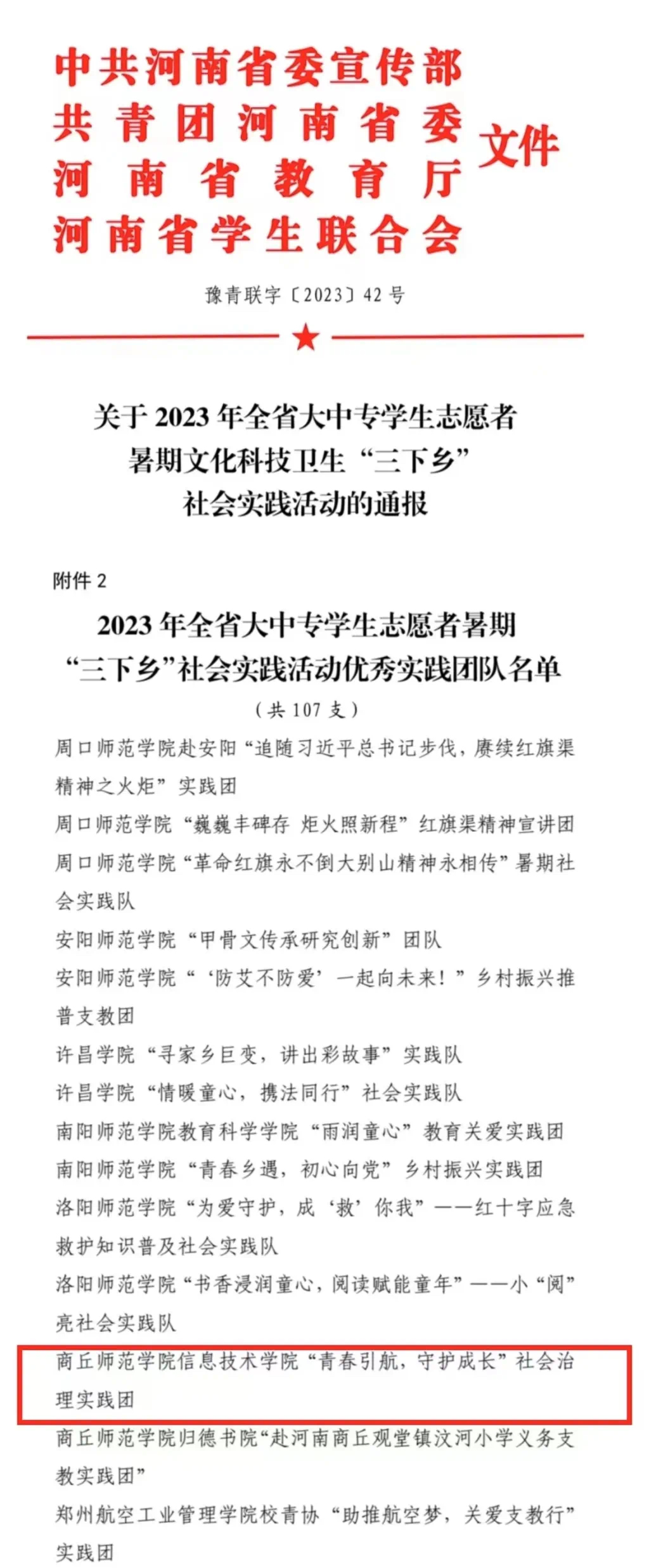 近日,团省委下发了《关于2023年全省大中专学生志愿者暑期文化科技卫生“三下乡”社会实践活动的通报》,表彰了积极组织、指导和参与社会实践活动并取得优秀成果的有关团组织、实践团队、品牌项目及个人,beat365官网“青春引航,守护成长”社会治理实践团获评优秀团队。