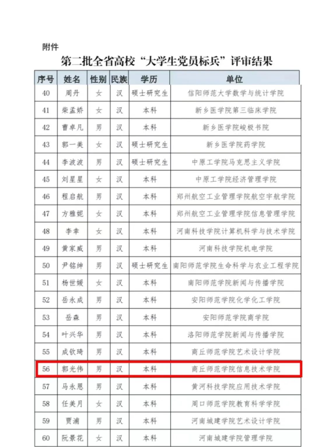 近日,第二批全省高校“大学生党员标兵”评审结果公布,经高校遴选、推荐和省委教育工委专家评审,共在全省高校中评选出100名大学生党员标兵,beat365官网学子郭光伟成功入选。