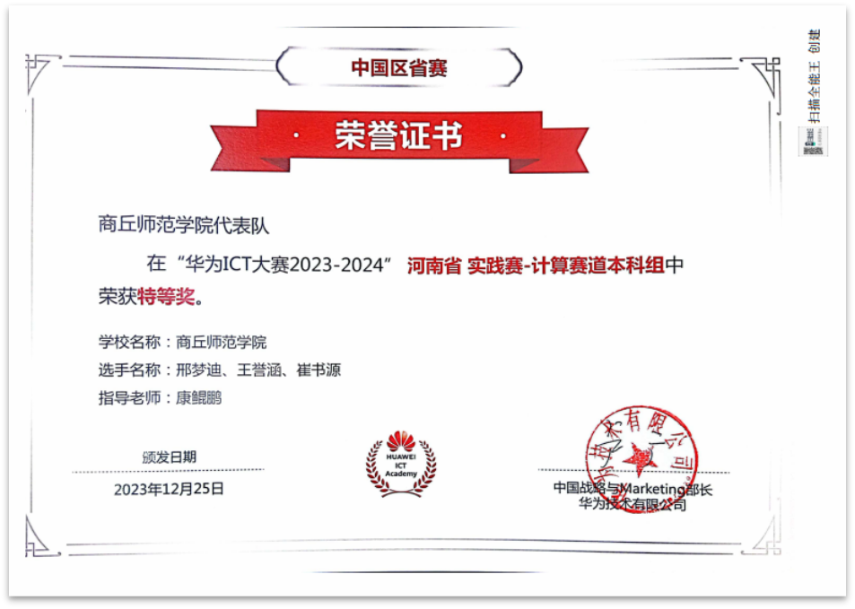 近日,ICT大赛2023—2024全国赛总决赛落下帷幕,信息技术学院学生崔书源、王誉涵、邢梦迪同学以河南省实践计算赛道唯一一组特等奖入围国赛,并斩获了2023—2024ICT大赛中国实践赛总决赛计算赛道三等奖。
