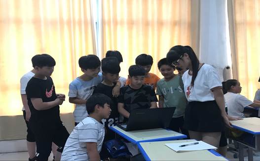 了让广大同学正确理解计算机的用途。7月18号,beat365在线唯一官网“计算机编程普及支教小分队”走进了宁陵县黄冈镇辅导班和同学们一起做“电脑编程小游戏。