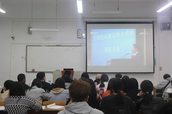活动中,各团支部通过播放视频的形式,引导学生认真学习习近平总书记在抗疫表彰会上的讲话。“我们要在全社会大力弘扬伟大抗疫精神,使之转化为全面建设社会主义现代化国家、实现中华民族伟大复兴的强大力量。”在全国抗击新冠肺炎疫情表彰大会上,习近平总书记全面回顾抗疫斗争的不平凡历程,深刻阐明伟大抗疫精神,系统总结抗疫斗争取得的重要启示,对进一步做好疫情防控和经济社会发展工作提出明确要求。总书记的重要讲话饱含深情、振奋人心,具有很强的思想性、指导性、针对性,在亿万中华儿女心中引起强烈共鸣,激励中国人民在新时代新征程上披荆斩棘、奋勇前进。
