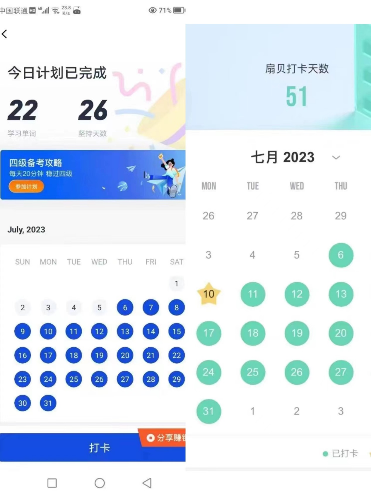 为提升学生英语学习积极性,切实提高四六级考试通过率,beat365在线唯一官网于7月6日起启动“英语打卡”活动,陪伴同学们四六级闯关之旅。