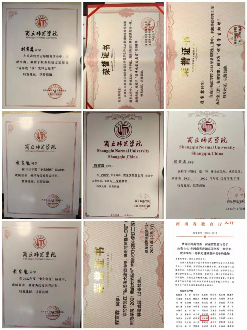 2021年高考后的暑假,程宣霖作为一名准大学生时就参与疫情防控志愿服务工作,当得知梁园区前进街道办事处团结社区还需要志愿者的消息后立即报了名,并根据社区工作人员的安排,多次参加社区疫情防控。后来还用自己省下来的零花钱买来了医用口罩,捐赠于社区。事迹于2021年8月被京九晚报采访报道,用实际行动协助疫情防控工作进行,为国家和社会贡献自己的力量。