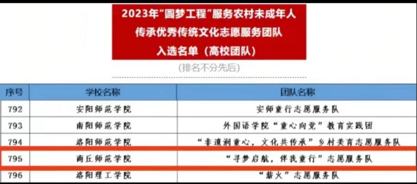 同时他带领学院青年学生和学校青年志愿者协会共同组建“寻梦启航,伴我童行”志愿服务队,参加中央文明办三局、团中央青年志愿者行动指导中心、中国青年志愿者协会秘书处共同开展的“圆梦工程”项目,积极开展各项以关怀农村留守儿童的志愿服务,团队成功入选全国2023年“圆梦工程”服务农村未成年人传承优秀传统文化志愿服务团队。