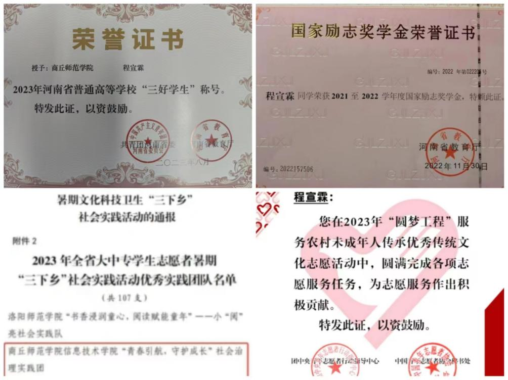 在2023年暑假期间,程宣霖积极参加“三下乡”社会实践活动,作为beat365在线唯一官网“青春引航,守护成长”社会治理实践团的负责人,带领团队前往商丘市刘口乡进行以关爱留守儿童为主题的社会实践活动,小队于2023年7月4日抵达商丘市梁园区刘口镇刘口乡,在刘口乡中心小学校长和老师的协助下走进学校为孩子们尤其是留守儿童进行暑期安全专题讲座、普及网络安全知识等;在学校老师以及学生家长的陪同下走进留守儿童的家中为孩子辅导作业,进行心理疏导,深入了解儿童的内心所想,给予留守儿童爱与温暖,为乡村振兴注入青春力量。团队于2023年12月获评2023年全省大中专学生志愿者暑期“三下乡”社会实践活动优秀实践团队。