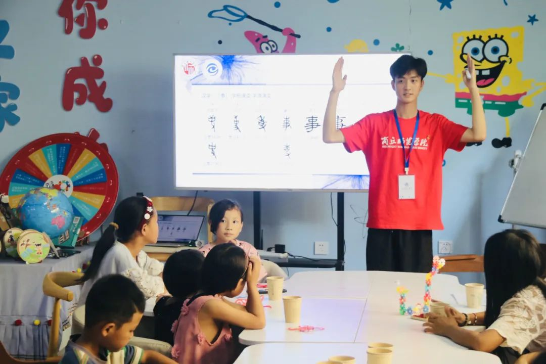 首先,实践团成员结合科普纪录片,通过图文并茂的讲解和互动活动,带领孩子们了解了甲骨文的历史背景、基本结构和书写方法,并将“甲骨文”与“广播体操”相结合,以肢体演绎19个甲骨文,在肢体展示和互动问答中,孩子们直观地感受到甲骨文的独特之美。