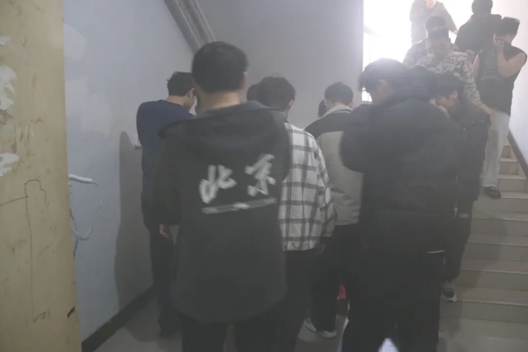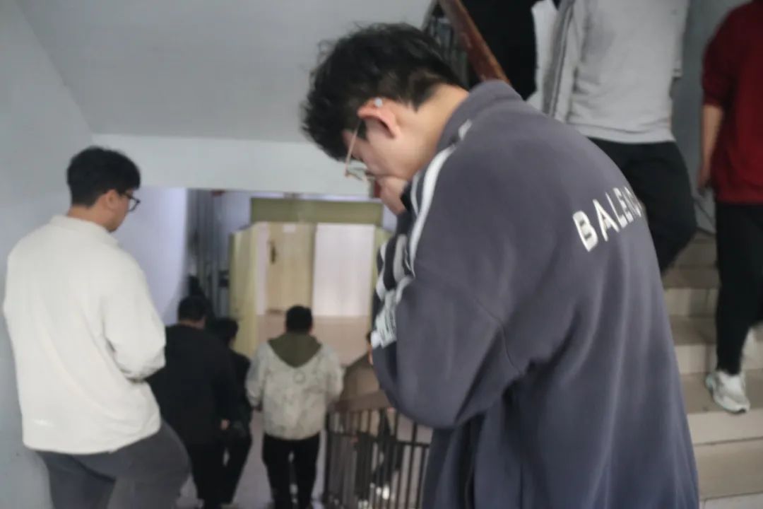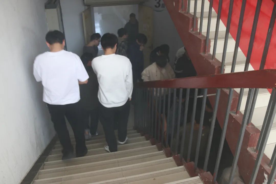 下午14:30,随着火警铃声响起,演练正式拉开帷幕。宿舍楼全体住宿学生迅速反应,在楼层总负责人和引导员的指引下,用湿毛巾捂住口鼻、弯腰低姿沿右侧墙体有序撤离。仅用10分钟,全体学生便安全抵达西侧羽毛球场和楼前广场集合点,各楼层负责人随即清点人数并上报指挥中心。演练全程紧张有序,展现了良好的应急素养。