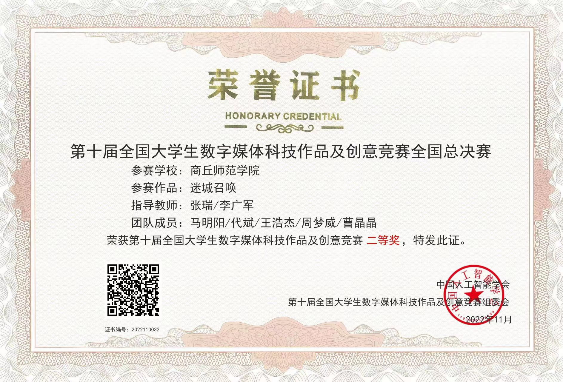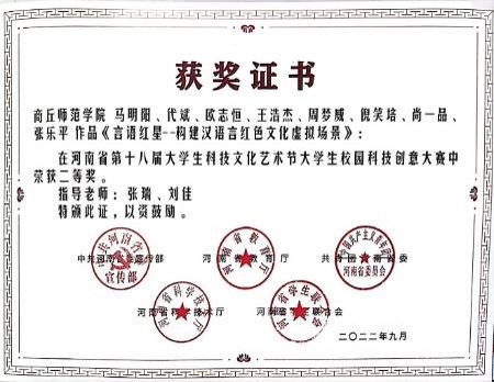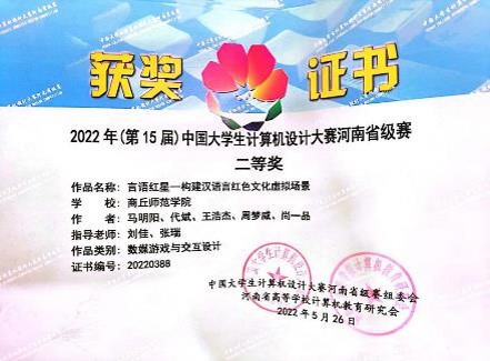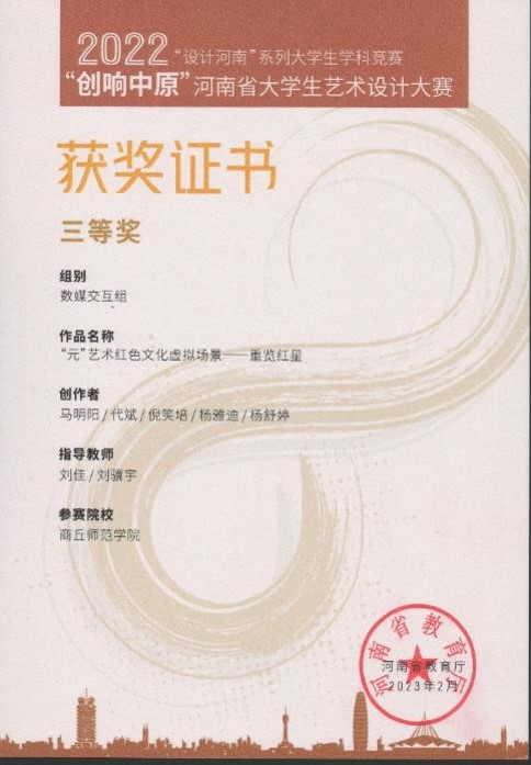 2022-2023年度获第十届全国大学生数字媒体科技作品及创意竞赛国家级二等奖、社团项目入选国家级大学生创新创业训练计划两项、省级四项,第十六届河南省“挑战杯”大学生课外学术科技作品二等奖一项、三等奖两项,中国大学生计算机设计大赛省级二等奖、全国高校数字艺术设计大赛省级二等奖以及学校举办的各类互联网+、挑战杯、三创赛等比赛校级奖项数十项。