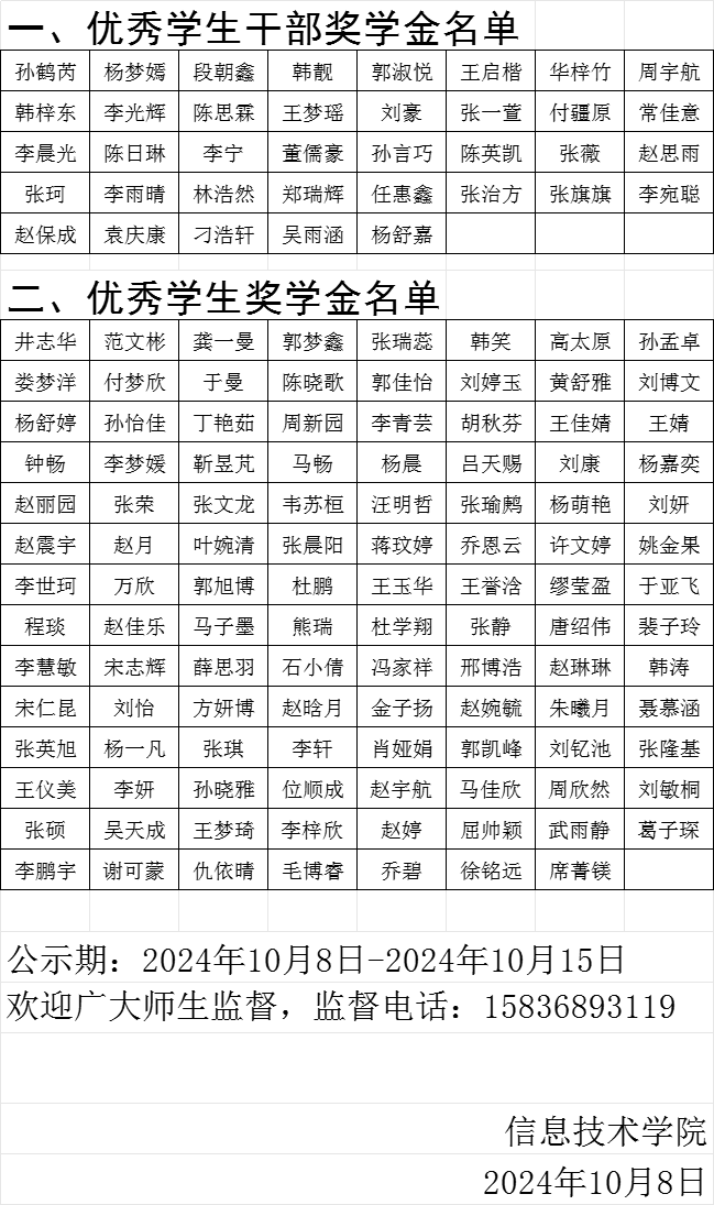 根据省教育厅和学校有关文件精神,经学院“奖学金、助学金评定领导组”评议,确定下列同学为beat365官网2024年优秀学生干部奖学金、优秀学生奖学金获得者。