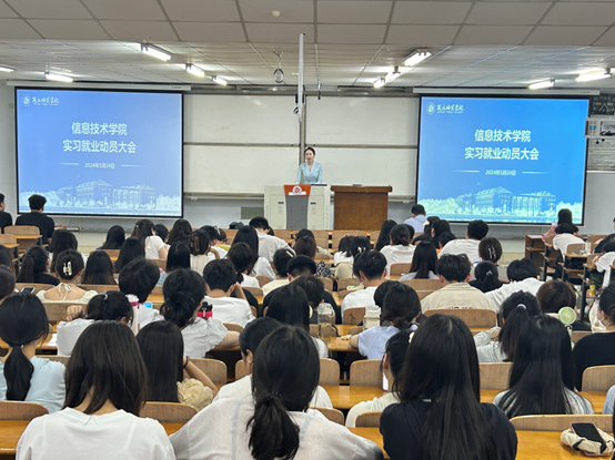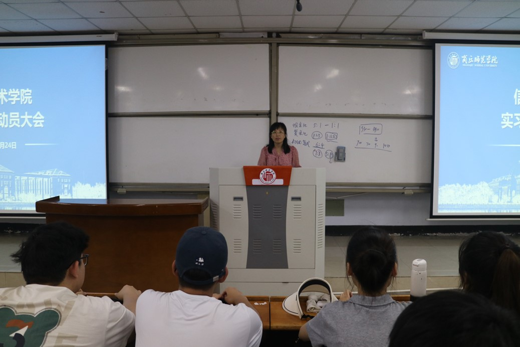 袁慧则通过分析当前的就业市场和环境,告诫同学们一要倍加珍惜实习机会,遵守实习纪律,遵守学院和实习单位管理制度,服从学院老师和实习单位领导安排,保质保量完成实习任务;二要尽快适应环境,完成角色转变,三要发扬特别能吃苦,特别能奉献的优良品德。积极克服实习过程中遇到工作、学习和生活困难,和实习单位保持良好沟通;四要注意人身安全、财产安全,做自己安全的第一责任人。同时本次动员会还邀请了2020级优秀毕业生和相关企业负责人向同学们宣讲交流实习公司情况,分享就业实习经验。