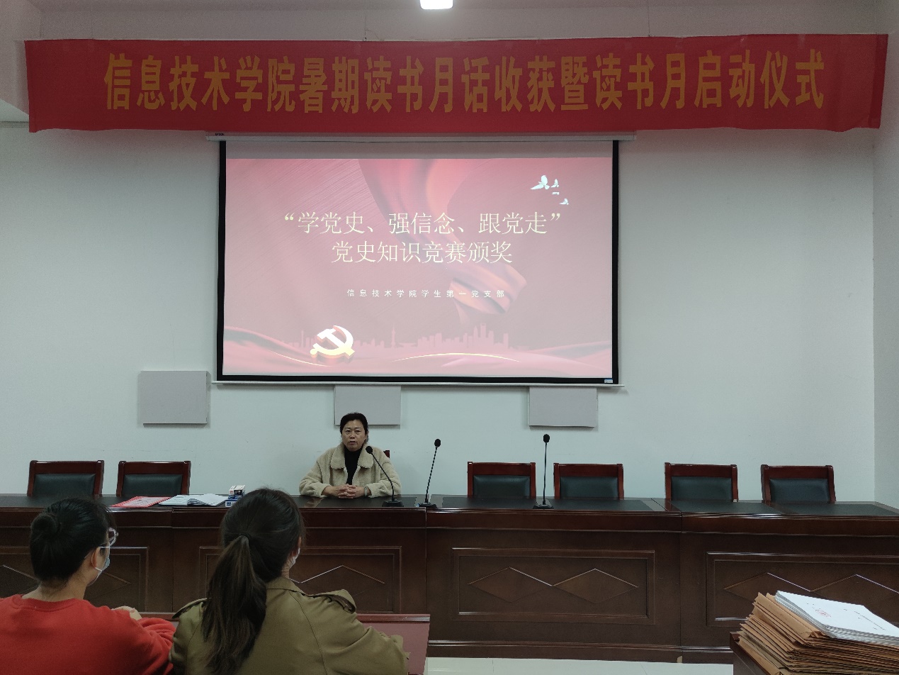 紧接着,进行了“学党史、强信念、跟党走”党史知识竞赛颁奖活动。戴老师担任颁奖人,获奖者们依次上前领奖。随后戴老师发表讲话,她提出要以赛促学,鼓励学生党员要进一步学习党史,了解党的光辉历程。