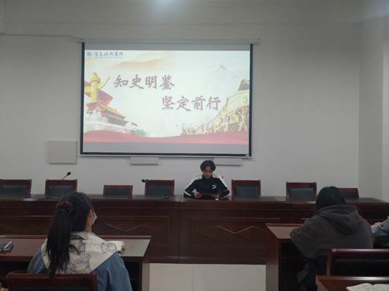 会上,学生代表引用习近平总书记的重要讲话,向大家阐述了历史对于人类社会的重要性,以史为鉴、资政育人。要从历史中汲取经验智慧,更好的战胜前进征程上的困难和挑战。接着,他带领学生们回顾了中国共产党艰苦奋斗的革命史,讲述中国共产党从以前的步步坎坷到现在的坚定前行的转变。最后,他呼吁新一代年轻党员要认真学习党史,要深刻认识幸福生活来之不易、新中国来之不易、中国特色社会主义来之不易,要以前人为榜样,不断努力和前进。