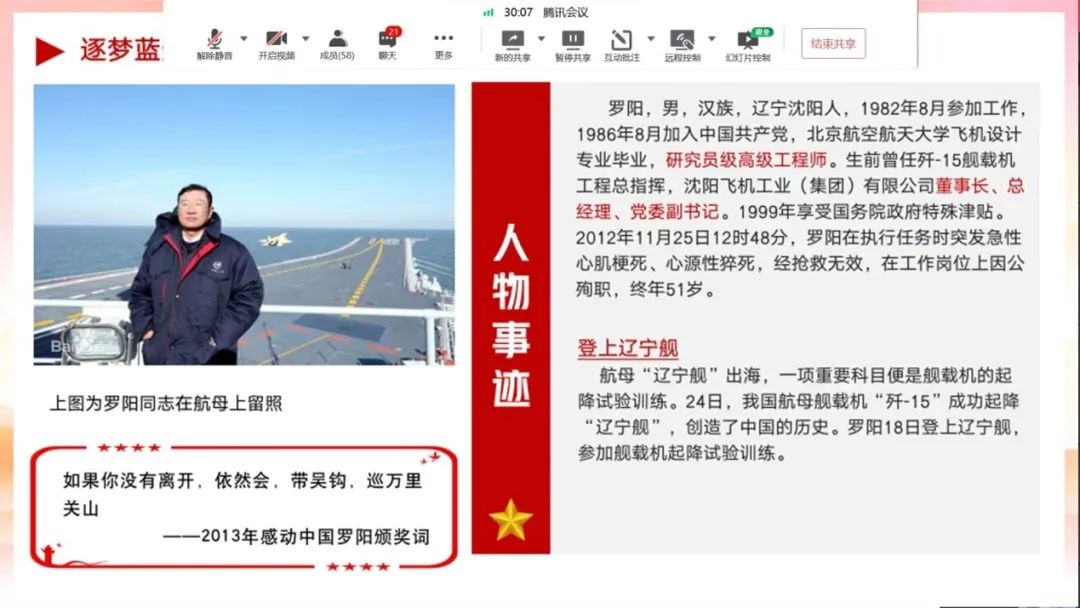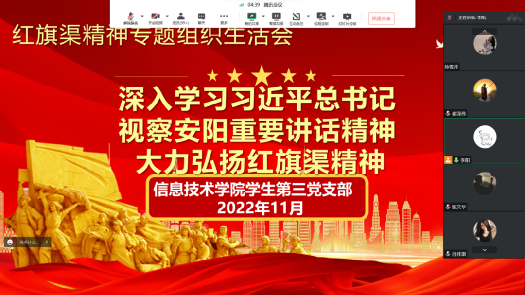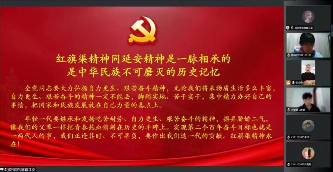 各学生党支部书记强调,青年党员们要深刻理解把握“红旗渠精神是我们党的性质和宗旨的集中体现,历久弥新,永远不会过时”的丰富内涵,从红旗渠精神中汲取不竭精神动力,引导党员干部深刻理解把握“自力更生、艰苦创业、团结协作、无私奉献”的红旗渠精神的丰富内涵和时代价值。激励青年党员学生要把个人理想融入党和国家发展大局,以罗阳同志为榜样,学习他矢志不渝、航空报国的爱国情怀,攻坚克难、勇攀高峰的拼搏精神。指出青年党员们要更加深刻领悟了习近平新时代中国特色社会主义思想,争做有理想、敢担当、能吃苦、肯奋斗的新时代好青年,为全面建设社会主义现代化国家、全面推进中华民族伟大复兴做出新贡献。