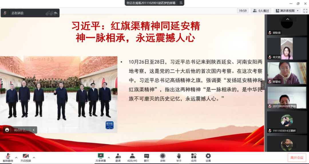 组织生活会上,各学生党支部书记根据学校党委《通知》要求,带领学生党员深入学习了习近平总书记在陕西延安和河南安阳考察时重要讲话精神、习近平总书记给中国航空工业集团沈飞“罗阳青年突击队”队员重要回信精神,组织学生党员集中观看了《根脉——红旗渠精神》纪录片。