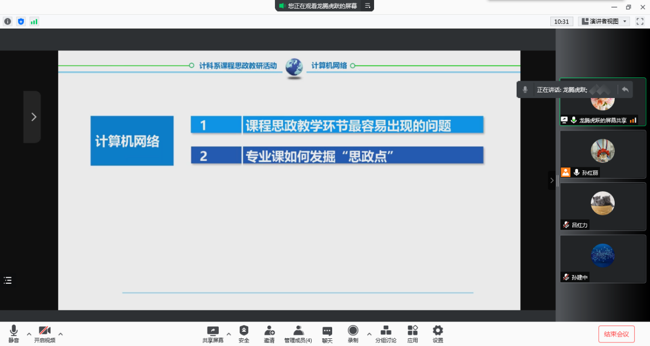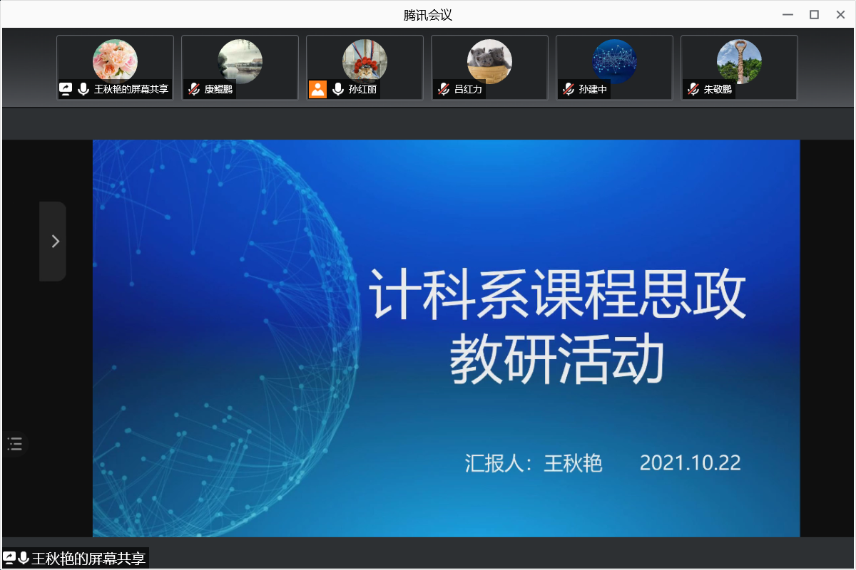 10月22日19点,计算机科学系采用腾讯会议平台开展《计算机网络》课程教学思政元素融入探讨。本次活动由王秋艳老师分享自己在探索如何将思政元素有机融入到课程教学的做法,并以具体一节课说明思政元素融入设计。