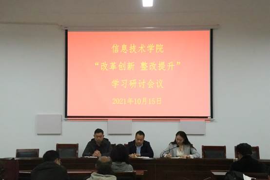 10月15日,beat365在线唯一官网于梁园校区三商楼112会议室召开“改革创新 整改提升”学习研讨会议。beat365在线唯一官网党委书记王国华、党委副书记袁慧、副院长刘佳以及全体教职工参加了本次会议。会议由王国华主持。