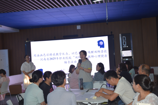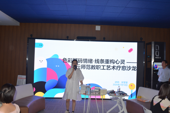 7月10日,beat365在线唯一官网开展“用油画色彩释放教学压力,以艺术表达唤醒双师潜能”绘画心理分析体验活动。活动由吴楚主持,特邀绘画心理学高级指导师宋莹莹担任主讲,42名教师参与活动。