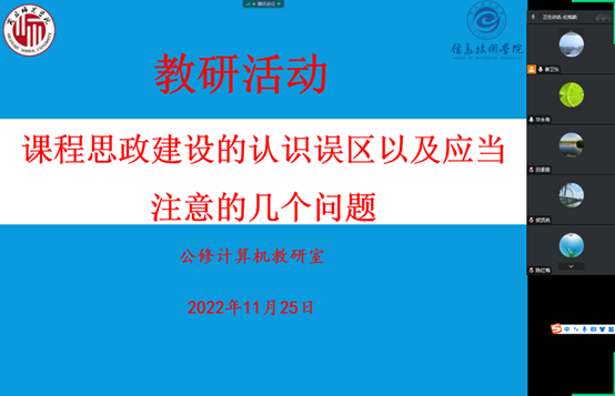 公修计算机基础教研室借助腾讯会议于1125日下午举行教研活动,会议主题为学习《课程思政建设的认识误区以及应当注意的几个问题》。教研室主任崔卫东主持会议,教研室全体教师参与了本次教研活动。