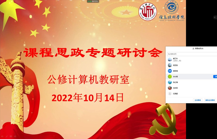 10月14日,公修计算机基础教研室借助腾讯会议举行了课程思政专题研讨会教研活动,全体教研室老师参加了会议。会议由教研室主任崔卫东主持。