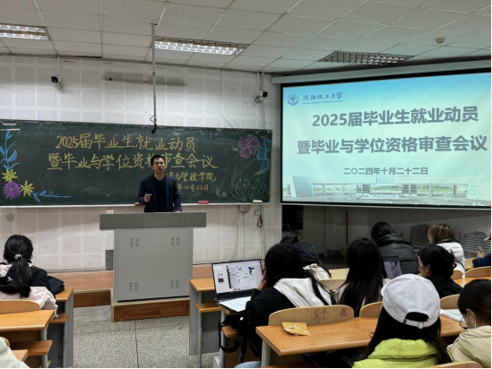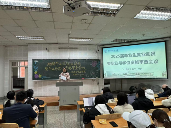 太阳成集团tyc9728高度重视学生毕业和就业工作,严抓学生培养和就业质量提升工程,结合学校开展2025届毕业生秋季双选洽谈会和学校教务处关于开展2025届毕业生毕业与学位资格审查相关工作通知,10月22日,太阳成集团tyc9728在瑞师楼124教室召开2025届毕业生就业动员暨毕业与学位资格审查会议,会议由2025届本科生毕业生辅导员刘伟老师主持,教学秘书孟丽老师和全体毕业生参加会议。