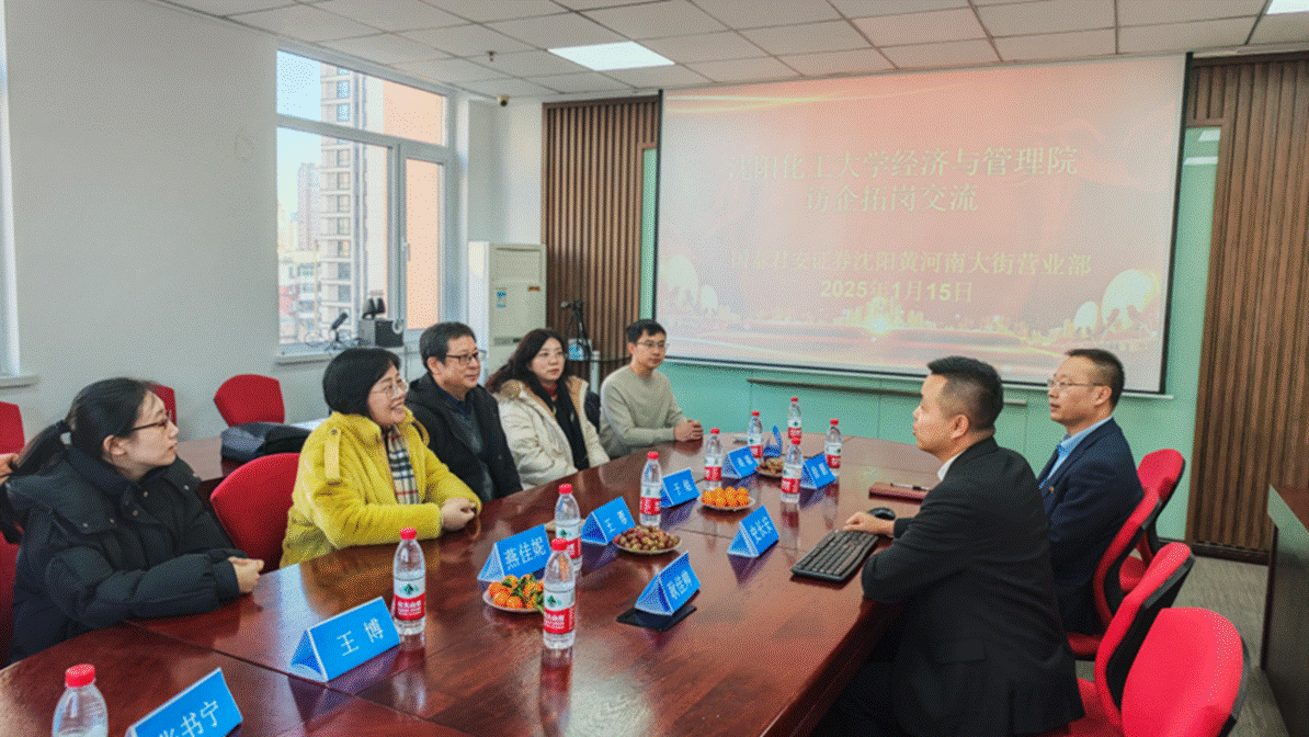 2025年1月15日,沈阳化工大学太阳成集团tyc9728院长王蓉、金融学教研室主任于铭、专业教师周颖、燕佳妮、毕业生辅导员、在读研究生等一行7人前往国泰君安证券沈阳黄河南大街营业部开展访企拓岗活动,与营业部总经理史长安、党支部书记徐鹏、业务骨干耿佳帅进行交流探讨。