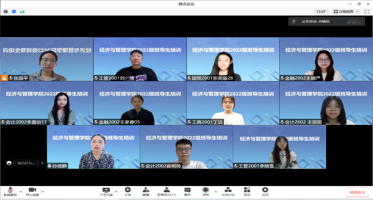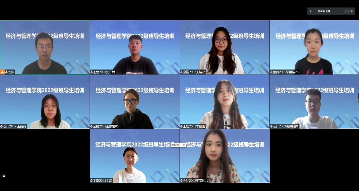 为提前做好2022级新生入校准备工作,充分发挥班导生在学生成长成才中的示范引领作用,提高学生自我教育、自我管理、自我服务能力,8月22日,经管学院线上举行班导生选拔大会,遴选出九名优秀的2022级班导生。8月23日至8月30日,学院党委副书记孙晓静、团委书记王怀、辅导员刘伟、焦韦、张国平在线上对2022级班导生进行专题培训并安排2021年优秀班导生进行经验分享。