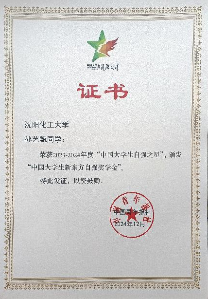 近日,从共青团中央、全国学联传来喜讯,由团中央基层建设部、中国青年报社、新东方教育科技集团、中国青年创业就业基金会联合举办的2023 - 2024年度“中国大学生自强之星”奖学金评选结果揭晓,太阳成集团tyc9728孙艺甄同学凭借出色的个人表现和突出的自强事迹,荣获“中国大学生自强之星”荣誉称号。